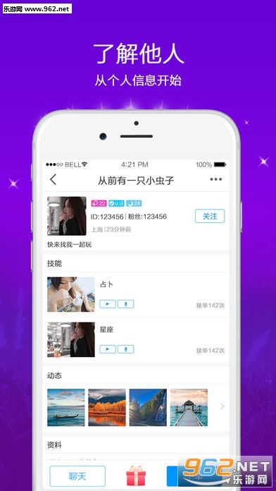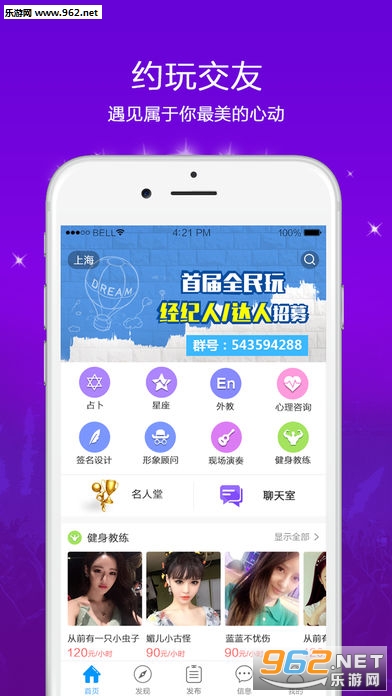 “全民玩”APP将带有明显的个人标签的达人技能作为主体,从每一个用户的喜好出发,用符合“人以群分”的哲学观点,让每一个用户都能轻松的找到想要结交的达人们,无论你是宅在家还是出去游玩,都可以与你附近的达人们一起,让你的生活不在单调无趣。
