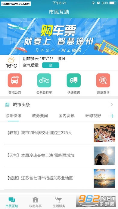 《智慧徐州app》这是一款徐州本地的资讯服务客户端。为徐州提供国际国内热点、城市头条、政务发布等信息内容,同时还有丰富的便民服务,涵盖了教育问题、医疗健康、智能出行、生活娱乐等分类,打造一站式资讯服务平台,让徐州市民的城市生活更加美好!