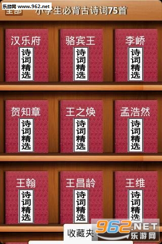 应用主界面根据作者排列诗词,点击“全部”可以直接查看全部诗词列表。诗词内容页面可以收藏指定的诗词到收藏夹,