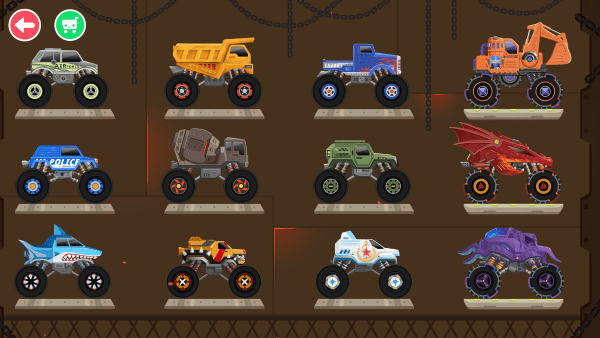 十二辆造型各异的车辆任你选择!是蓝色的重型卡车,还是造型独特的鲨鱼车,选择最适合你的车辆参与到比赛中吧!感觉你的车辆速度不够快?快用比赛中获取的金币,来给你的车来个从头到尾的改装吧:性能更好的避震弹簧,抓地力更强的车轮,或是马力更强的引擎。自由选择改装,让你的大脚车比别人更快一步!