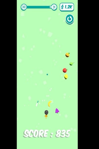 1、手指控制刀在屏幕上滑动,而是点击飞刀,切爆扔出的水果。