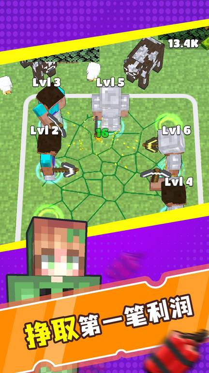 这是一个以挖掘矿藏为背景的放置休闲游戏。玩家扮演熟练的矿场工人,拿起鹤嘴锄,在矿产丰富的区域努力挖掘,获取收益,雇佣矿工深入挖掘,通过合并角色进行升级,获取丰厚收益。