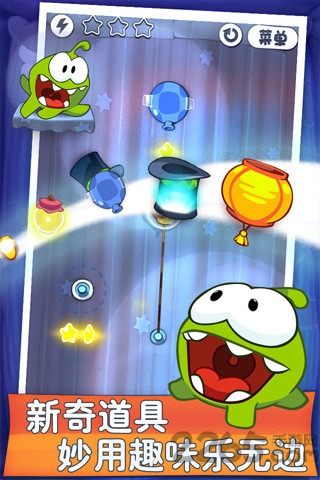 游戏操作便捷,你只需滑动手指,剪断绳索,并在各色新奇道具的帮助下,想方设法使绑着的糖果掉入小吃货Om Nom的嘴里,即可圆满它甜蜜的糖果梦。