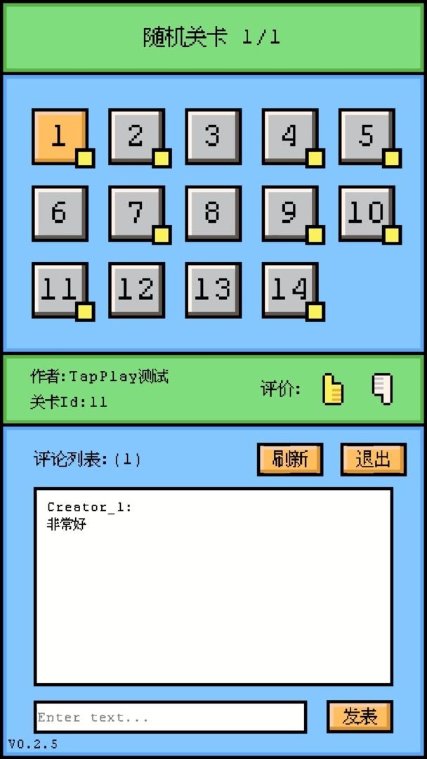 连接上服务器后,你可以上传自制关卡、下载玩家制作的关卡、在游戏中对其他玩家的关卡进行评论、点赞等.在后期将开放各类排行数据,选出优秀关卡合计、点赞最多关卡排行等等.