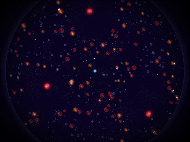 初始时,空间中充斥着零散的星体,所有大过玩家的星体都以红色星晕展示,那些淡蓝色星晕的星体就是我们饱食的对象,速速接近吸收强大,之后会发现之前一片红色光晕的星体变成淡蓝色星晕,这是新的征服对象,也是我们强大的象征。