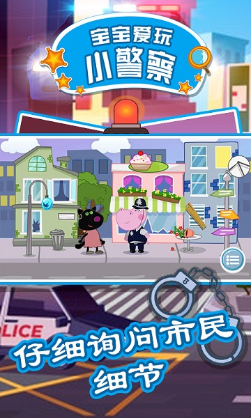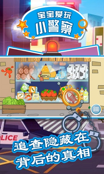 宝宝爱玩小警察游戏是一款警察题材的冒险侦探游戏。玩家可以自由探索每一个角落,许多的挑战,任你随心所欲地进行挑战,在处理案情的情况下,注意自身安全,犯人是很危险的,不要轻易相信他们,这项工作需要你非常的谨慎,注意力要集中,感兴趣的小伙伴们还在等什么?就快来下载试玩吧!