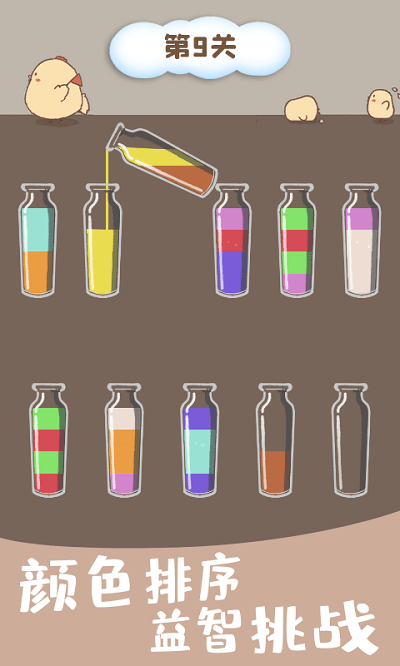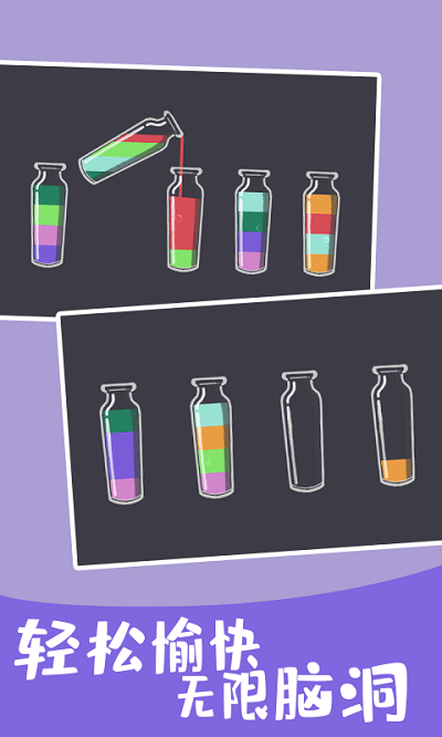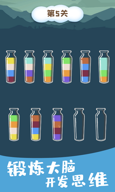 有趣且有教育意义的休闲游戏,玩法非常简单。玩家只需将玻璃杯中的水按颜色分类,即可将不同颜色的水聚集在同一个玻璃杯中。游戏中设计了很多关卡。具有挑战性和悠闲解压的小游戏,可以在娱乐的同时锻炼你的大脑。一瓶只能有一种颜色,快来试试吧,看看你有多聪明!
