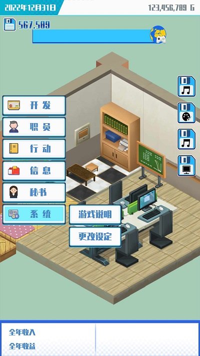 游戏公司模拟器游戏手机版让你在游戏中成为游戏公司老板,在这里建立自己的公司,招聘一些游戏开发的岗位职员吧,在这里根据市场热度来进行策划制作游戏吧,游戏上市后看看你能够收获多少的玩家和流水吧,在游戏中一步步扩大公司经营和游戏数量,成为游戏公司大佬。