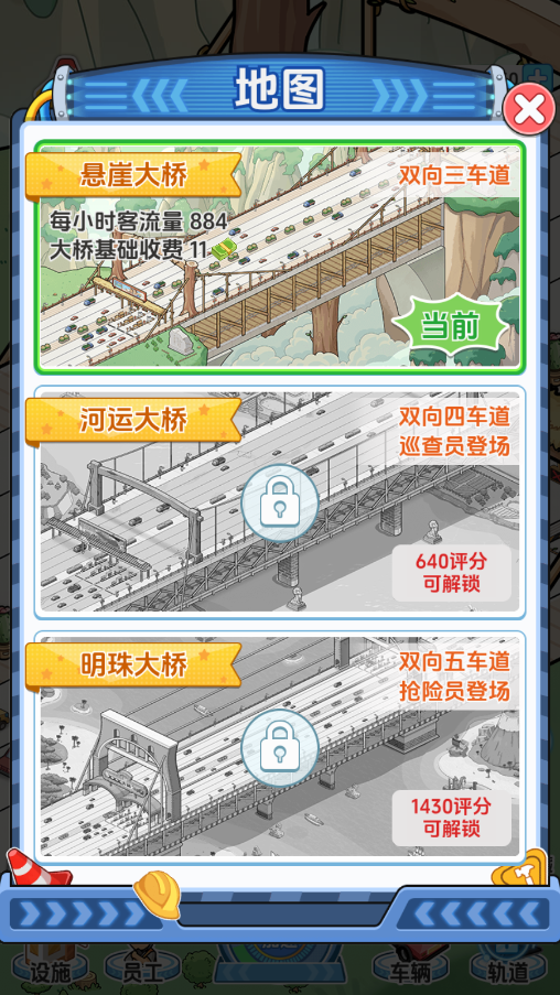 2.建造完成后,玩家需设置收费站、调整收费标准,并定期维护桥梁,避免因老化或超载导致坍塌,影响公司声誉和收入。