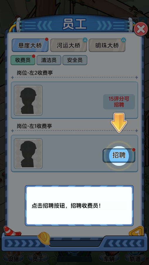 桥梁日常需要维护,老板可以招聘收费员收取过路费,招聘安全员和巡查员日常检测桥梁安全,招聘清洁工保持路面干净,招聘抢险员在里面需要维护的地方进行紧急维护。