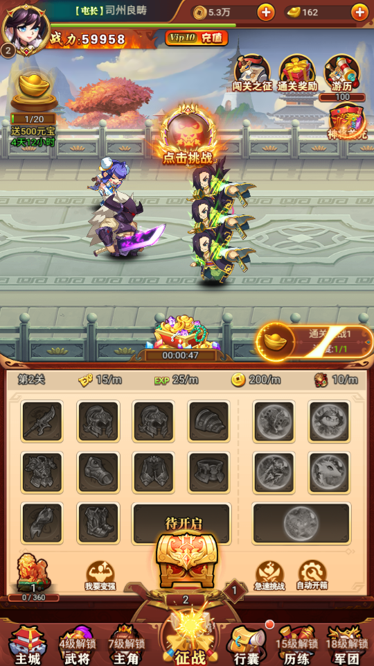 2、点挑战,可以闯关打boss,下方还有宝箱可以开装备