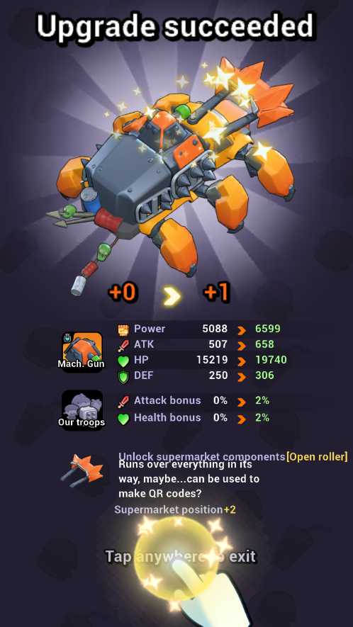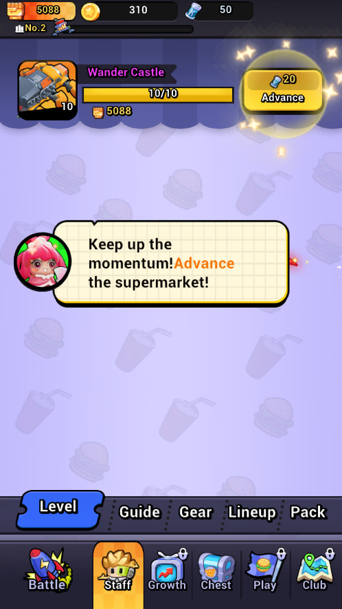 《流浪超市》是一款融合了塔防割草元素的“咸鱼like”产品。玩家在游戏中可以通过自动战斗收割源源不断涌来的敌人,获得宝箱、金币、英雄经验等奖励,而后玩家可以利用这些奖励提升超市等级、招募英雄、提升英雄等级、优化英雄装备等养成模块,与此同时,超市和英雄属性的提升又将反过来提升战斗效率,以此形成游戏的玩法循环。