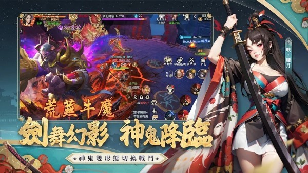 1、玩家可以在神与鬼两种形态间自由切换,释放出震撼的战斗技能。