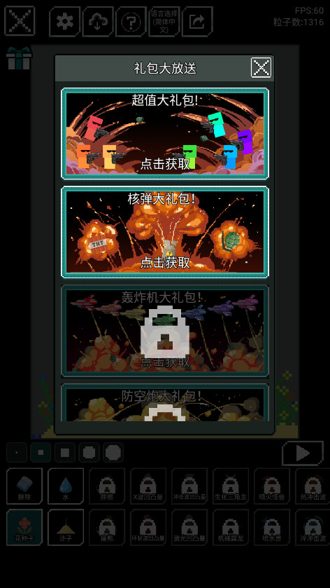 这是一个像素沙盒游戏,你可以将多个不同的元素放入场景中,形成一个独特的小世界。