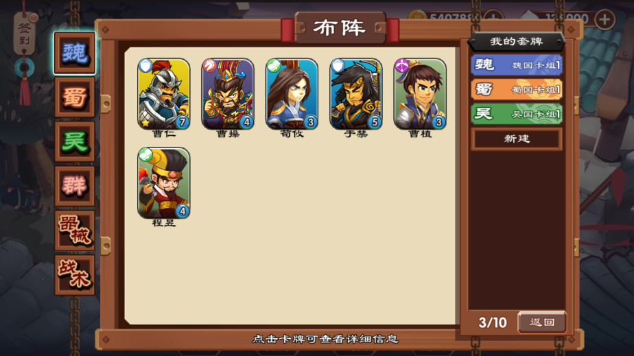 单机三国志3是一款讲究策略玩法的卡牌放置类手游,该游戏采用了最新的战斗方式,与系列前两部作品完全不同,也不同于市面上的任何其它游戏。也正是因为这种创新的玩法,使得游戏最终的品质绝对会让你满意。而游戏中主要的战斗类型分为对攻、守城、攻城、突袭4种。每个战斗类型的胜负条件不一样,关卡3星获得条件也不一样。在单机三国志3手游中,我们战斗之前需要布置阵型,也叫搭配卡组,目前阵型分为魏,蜀,吴,群,全5种。顾名思义,本势力的阵型,只能使用本势力的武将。