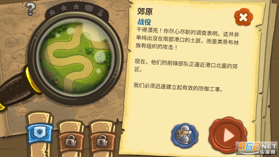 游戏提供三个存档,游戏初期会有新手介绍,并且在每一关出现新的敌人种类都会有提示,告诉你敌军的特征。而这时你要根据提示做好准备。跟一般的塔防游戏不同,游戏中每关可以提供的防御塔建造地点是有限的,你要思考好你的防御策略,扼守要地。