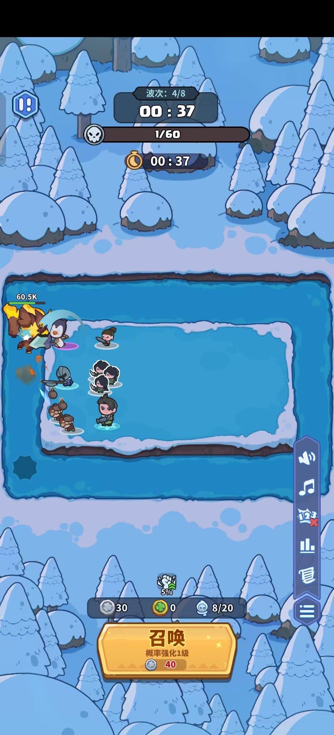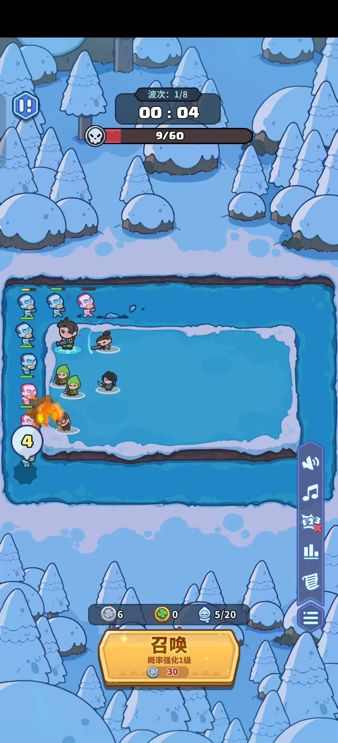 在第5波倒计时结束后,迅速消耗掉700银币升级“招募概率强化”,剩下的银币开始召唤,以应对第6波的小boss。