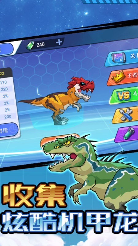 非常激动人心的机器恐龙的战斗,玩家可以看到各种各样的恐龙。在完成比赛的挑战后也可以得到不同的奖励,玩家还可以解锁使用各种类型的恐龙,操作非常简单,不断升级。