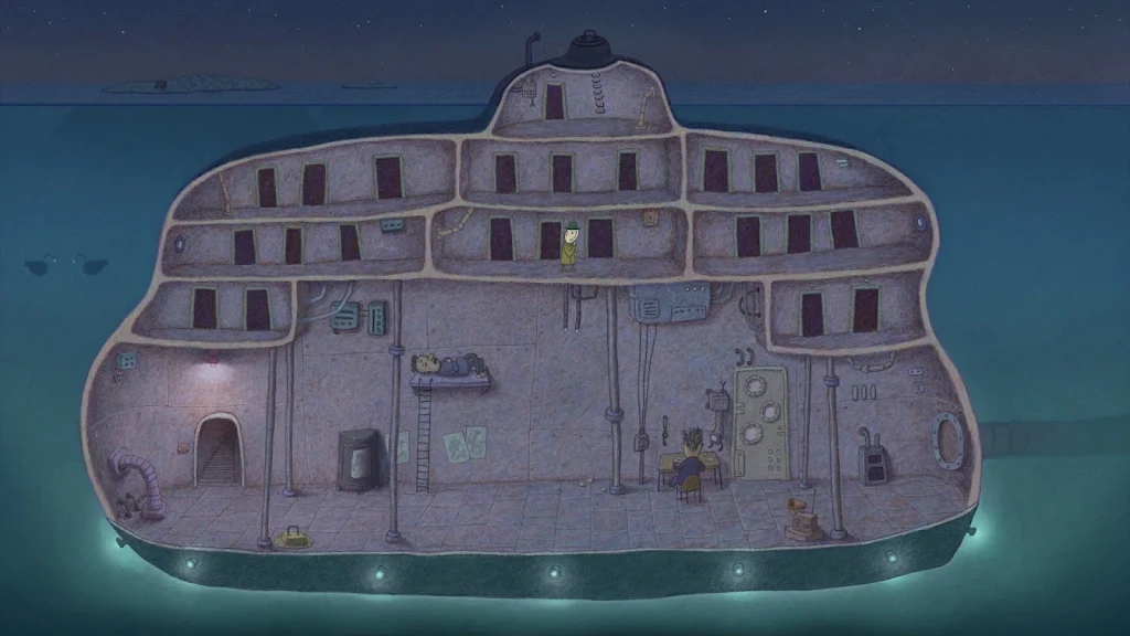 进入三只眼怪物的潜水艇后,通过管道向右移动来到深海,第四只猫会穿着潜水服从画面左上角慢慢游进