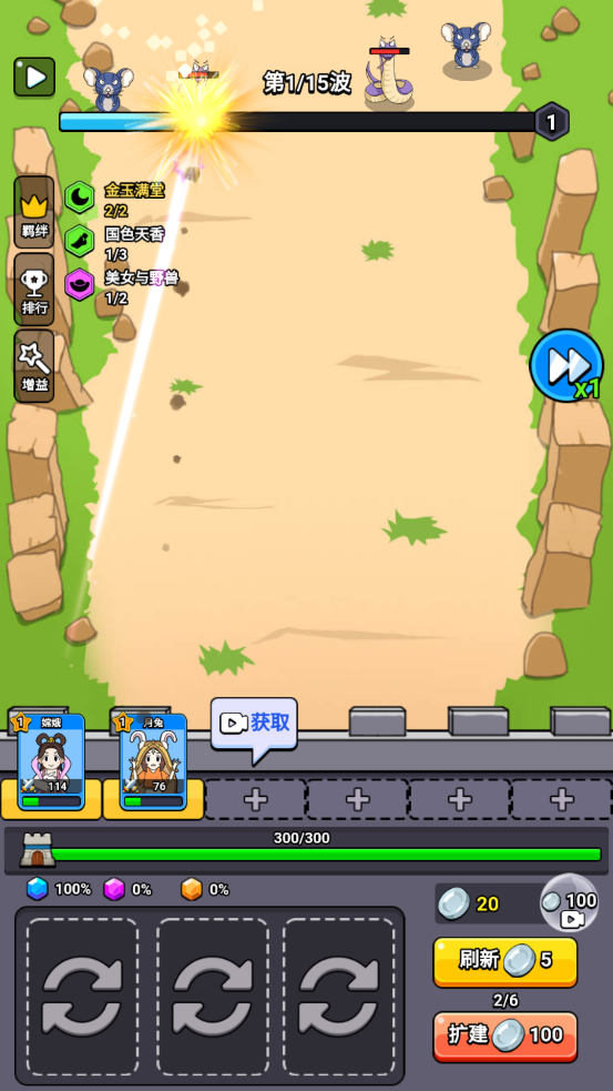 点击【刷新】来不断刷新角色,选择自己需要的角色上阵,相同角色再次选择会进行升级,最高可以升到5级满级