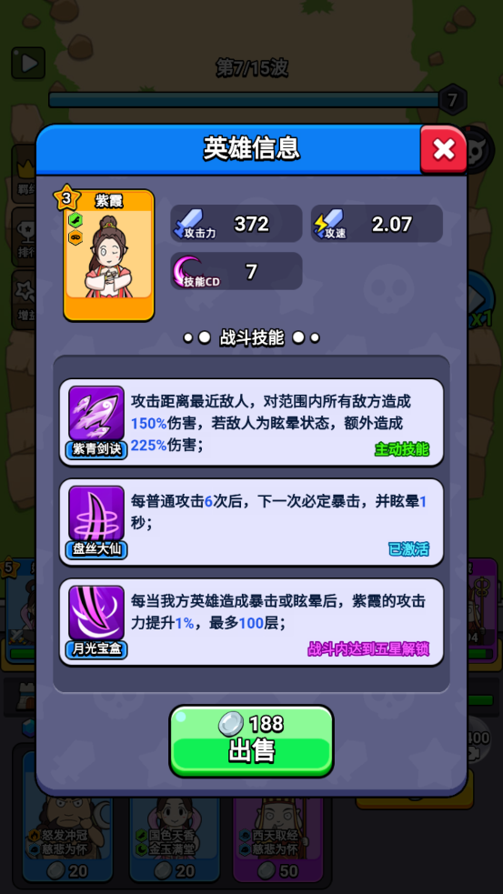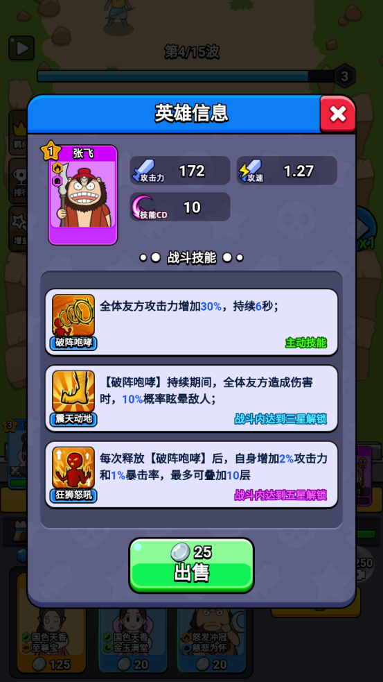 点击上阵的角色可以查看信息,也可以出售来空处卡槽换其他的角色