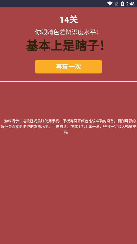 记录与分享功能:游戏会记录玩家的测试成绩,并允许玩家将成绩分享给朋友或社交媒体,让更多人了解你的颜色感知能力。