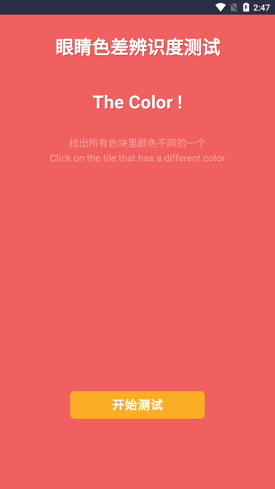 《找色差小游戏》这是一款有趣的测试小游戏,在这款游戏中你需要找出图片中和其他方块不一样的色块,根据你的测试水平了解你的颜色感知能力。同时建议使用好一点的手机屏幕或者平板来进行测试,可能会和最后的结果有关,快来试试吧!