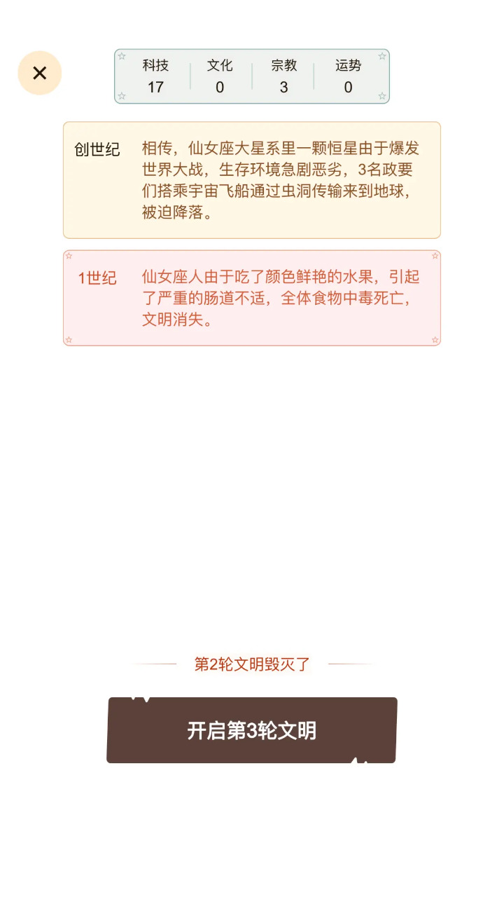 第二步:合理分配你的创世属性值。比如:科技6 文化6 宗教3 运势5,一起打造最6的文明!