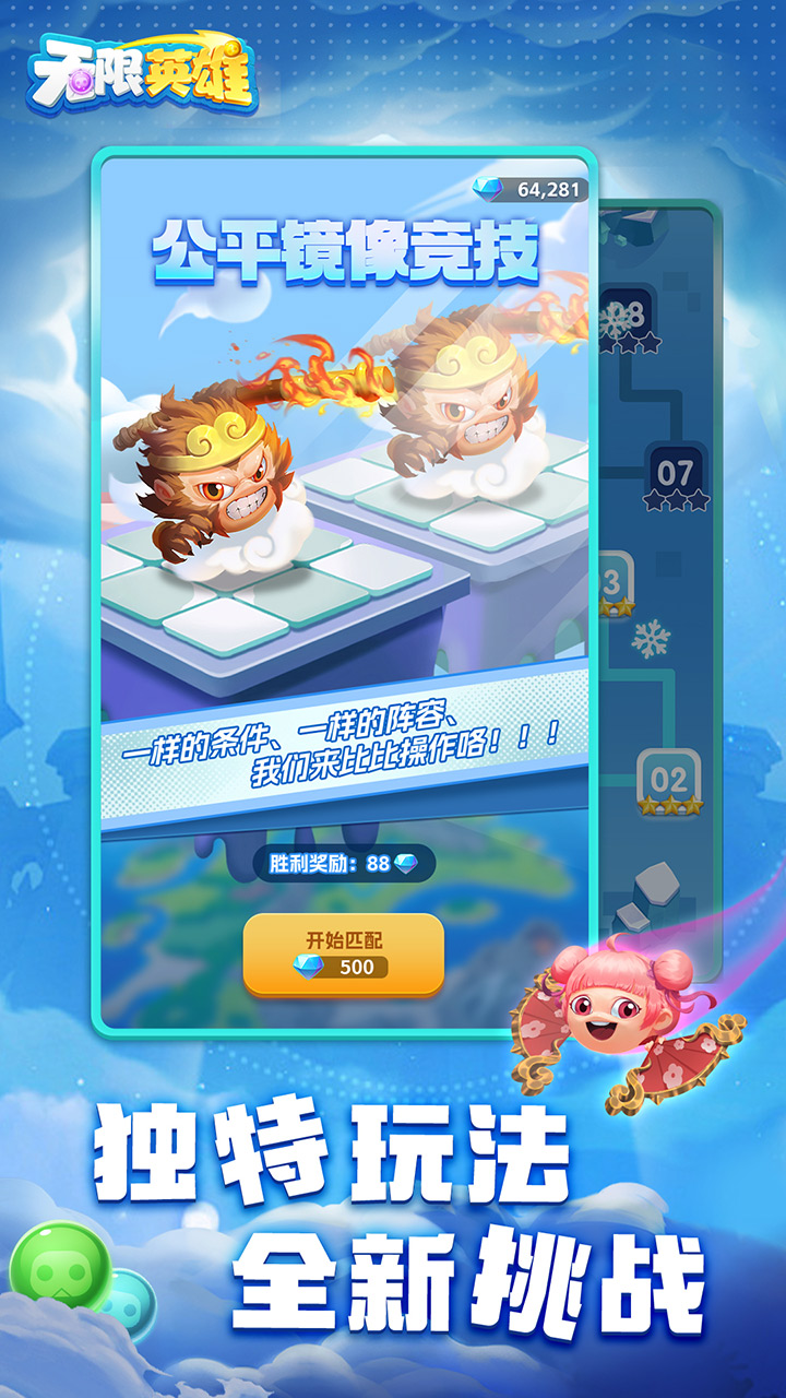 《无限英雄》是一款独特的策略对战游戏,需要通过充满策略和技巧的英雄摆放来创造属于自己的胜利! 英雄们的特性各异,总有适合自己的战斗方式 例如,射程较远的英雄能够以无伤代价攻击远处的目标,而射程较近的英雄能给面前的单位造成巨额伤害。 创造一个独特的策略战术,在与对手的交战中取得胜利! 每种阵容搭配都有自己独特的趣味,尝试不同阵容,并在每场战斗中不断成长! 目前游戏内已经包含多种战斗模式: 1v1对战 最基本的模式。 选择5个英雄组成一套阵容。 你将从最低段位逐渐成长为一名顶级的王者! 合作模式 在这里你将于另一名玩家共同合作 在敌人源源不断的进攻中持续升级阵容 当然,与重重挑战一同到来的还有丰厚的奖励! 乱斗模式 你将在限定时间内与来自各地的玩家们同台竞争。 在多场车轮战斗后最终的王者也将随之诞生。 这里有着与1v1截然不同的竞技体验!