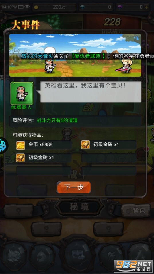 《勇者大作战》虽是挂机游戏,但可它不是一款简单的挂机游戏。《勇者大冒险》拥有独特的国战系统。国战可谓是每一个勇者都梦寐以求都想参加的战斗。为什么?自然是因为国战不仅能给玩家带来荣耀,而且还有令人意想不到的丰厚奖励呦!