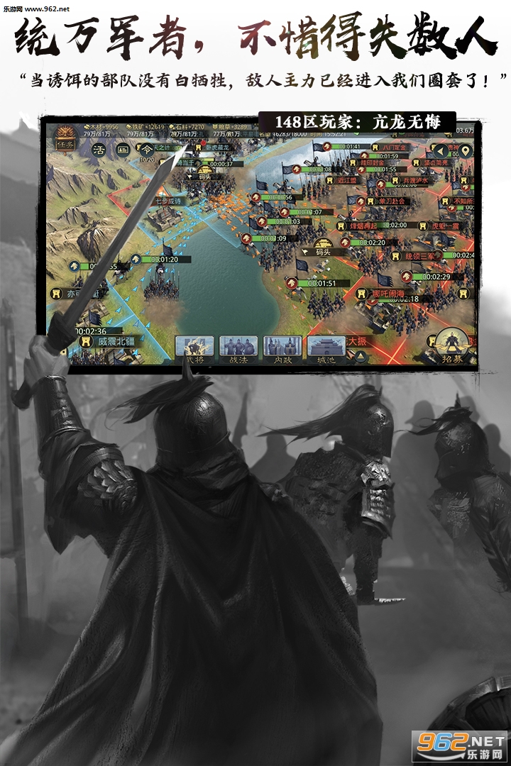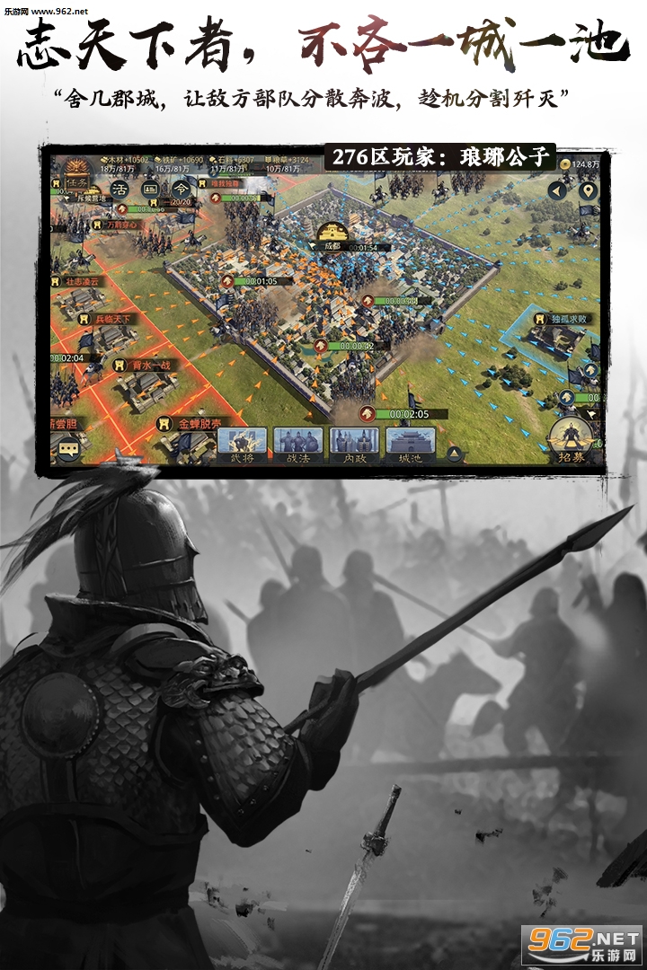 在这三国乱世,没有牧歌田园,每个踏上征程的人,都想争霸天下。曾国藩说:谋大事者,首重格局。既是“平天下”大事,亦需要更大的战场,才能盛下足够大的格局——真实复刻汉末十三州,数万玩家,合作竞争,搏一个洛阳城;225万格土地,十万支部队,东征西讨,还原冷兵器时代行军,安营扎寨,分团作战;数十同盟,亦敌亦友,弱肉强食,在局中,争作执棋人,或沦为棋子;一城而起,立盟,建国,到席卷天下,几经沉浮,步步为营。