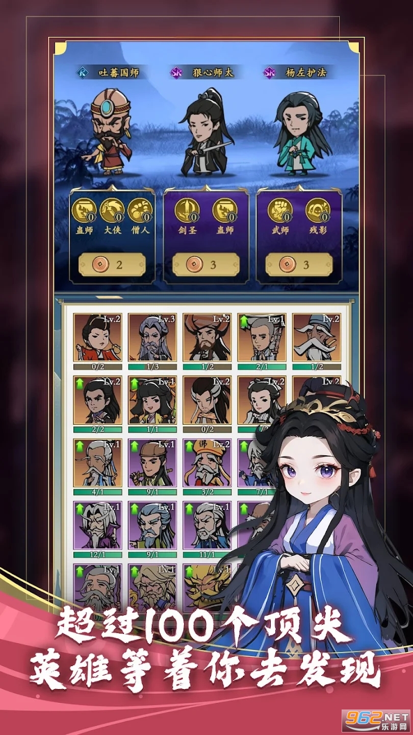 在这款游戏中, 拥有超过100位武林英雄可供选择, 释放英雄独特的战斗能力. 英雄包括著名的武侠小说中的传奇人物, 如独臂剑客杨过、小龙女、东方不败、金轮法王等. 展开属于你的武林传奇吧!