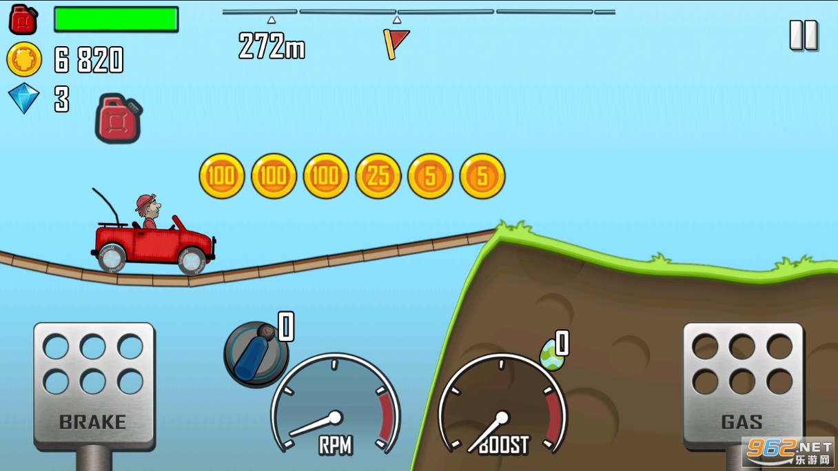 2、玩法非常简单,玩家需要控制赛车在崎岖的路面上行驶,左边按钮控制刹车,右边按钮控制油门;