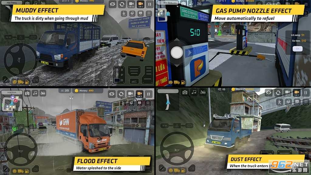 我们精心照顾了这个游戏的细节。例如,当穿过泥泞时,每种污渍都会粘在汽车上,当车轮穿过水坑时,水会喷到两侧。当车辆进入土路时,会产生烟雾和灰尘效应。加油时油泵自动移动的效果非常逼真。 越南迷你卡车模拟器绝对是世界上最好的卡车驾驶游戏。