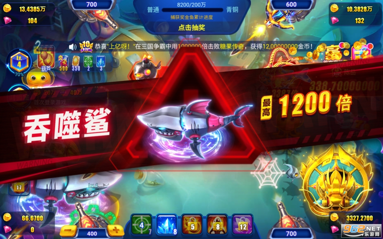 千炮只是起步,万炮不是终点!捕鱼玩法大升级!全网独创炮灵系统,给您的炮台加农炮,上下炮率捕鱼!酷炫特效,让您(一炮亿金)爽不停!