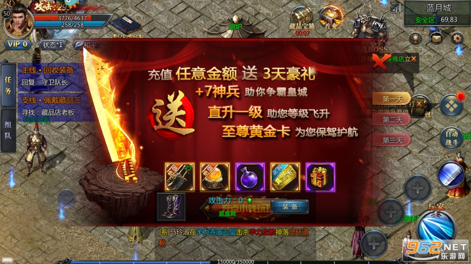 6、公会与探宝:尽量早些加入进公会,公会仓库可以换取自己所想要的装备,尽快地提升自己的攻击力,如果想要升级快的话那就把探宝的转生装备存工会仓库,然后你就有积分换取60-80的装备来回收经验,武器和衣服就不要再回收了,没有首饰来得划算。