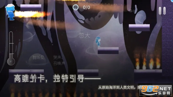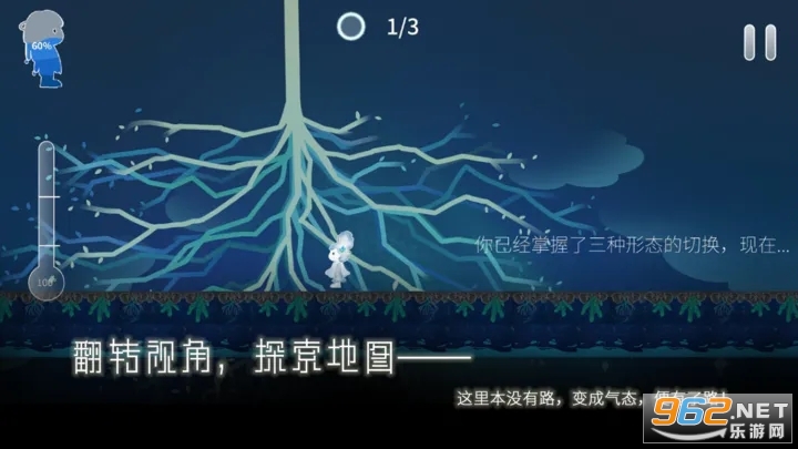 Return Water to Water游戏是一款平台跳跃类游戏,在游戏中我们要扮演一个女孩Chole,带着Gene所授予的能力,去灌溉失去颜色的生灵。游戏玩法就是经典的跳跃操作,点空白处可以查看地图,而Chole可以转换为三种形态——水、冰、汽。水形态不会摔死,但是不能跳跃,冰形态可以跳跃,但是稍高一点就会摔死,汽形态是反转过来,也不会摔死。而灌溉生灵,则需要水形态或者汽形态,冰形态是不行的。灌溉生灵前他是晦暗的,而灌溉后变获得了色彩,主角也会失去20点生命。