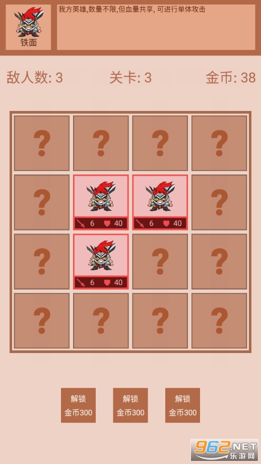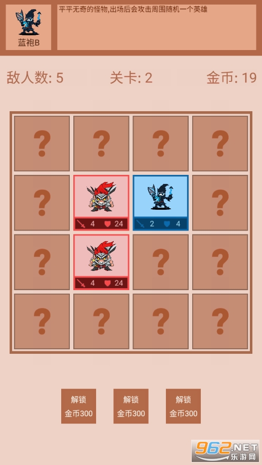 《迷你战棋2》是一款刺激好玩的战略游戏。玩家需要点击问号格子来揭示敌人的位置并发动攻击。如果格子里没有敌人,那就会放置我方英雄并进行攻击。通过策略性的决策和精准的攻击,玩家可以逐渐占领更多的格子并击败所有敌人。快来挑战你的战略能力和反应速度,在战斗中展示自己的智慧吧!