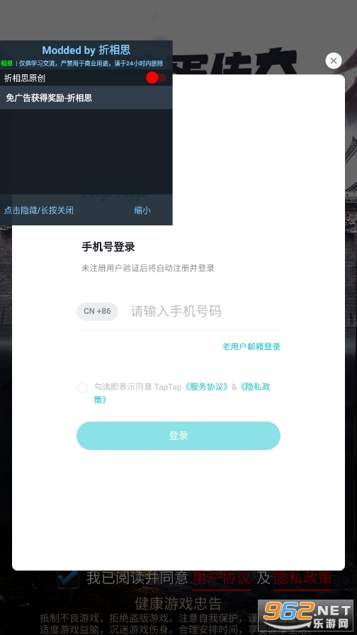 必须卸载手机上的tap,进入游戏方可手机号进入,可能需要多点两次进入,免广告获得奖励