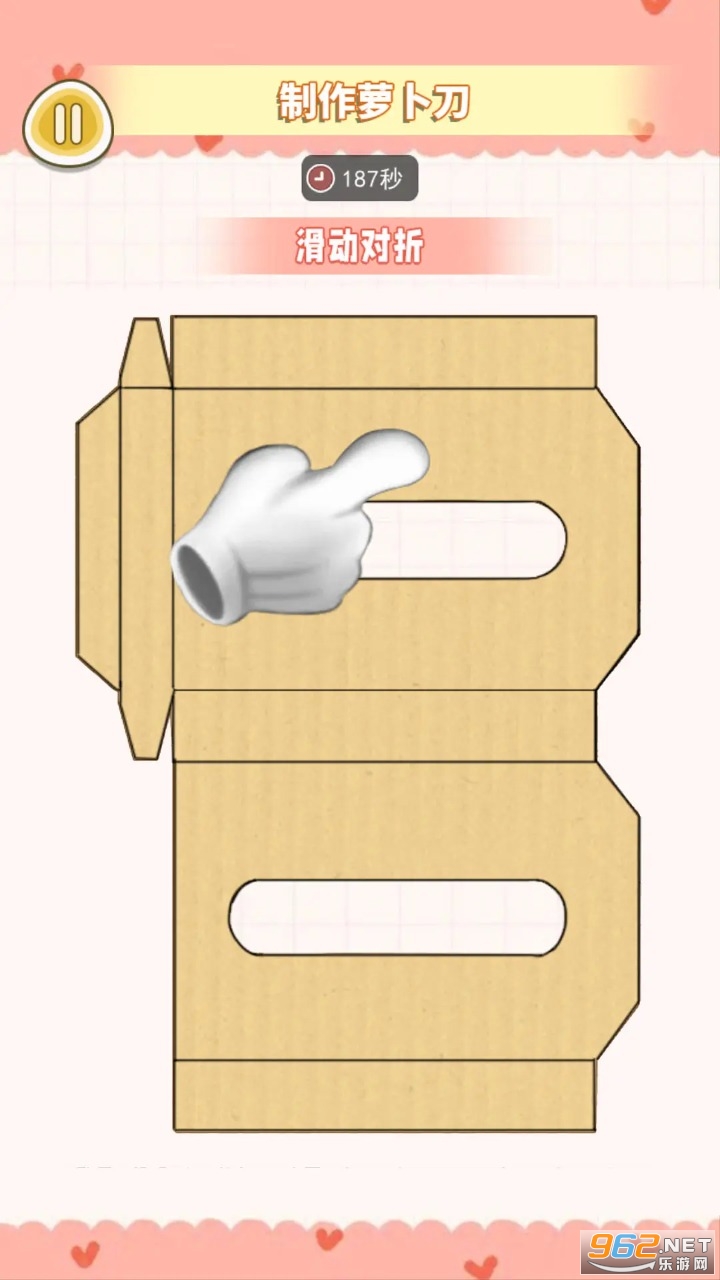 玩法围绕着制作纸盒萝卜刀展开,你可以按照游戏内的教程逐步完成创作过程。从切割和折叠纸盒,到上色和装饰,你可以在游戏中发挥创造力,打造出独特的作品。这是一款适合所有年龄段玩家的休闲游戏,让你尽情发挥想象力,享受轻松的创作过程。