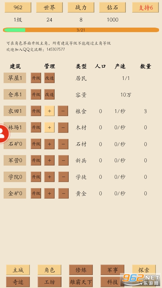 在主城建设农田、房屋,产出粮食、吸引人口,分配人口至林场、石矿、军营、学院、金矿工作,提高相应初级资源产出。