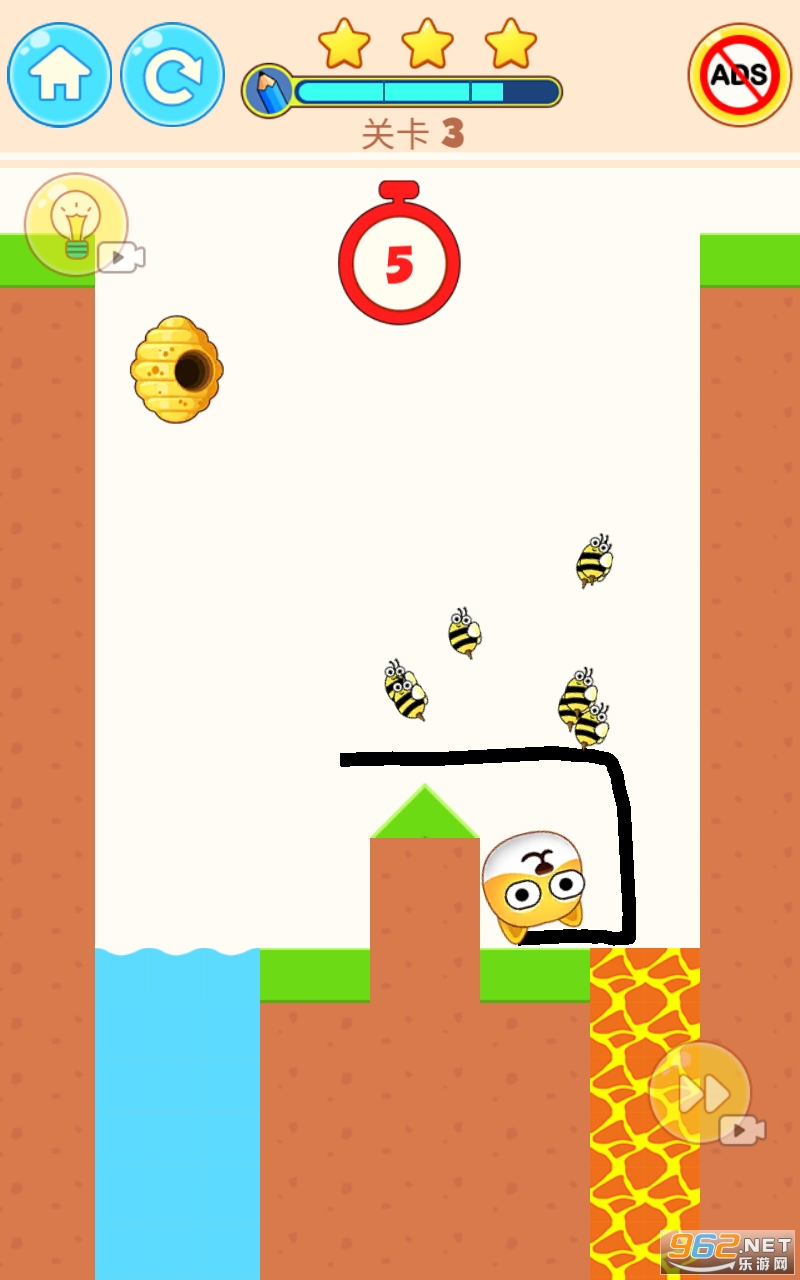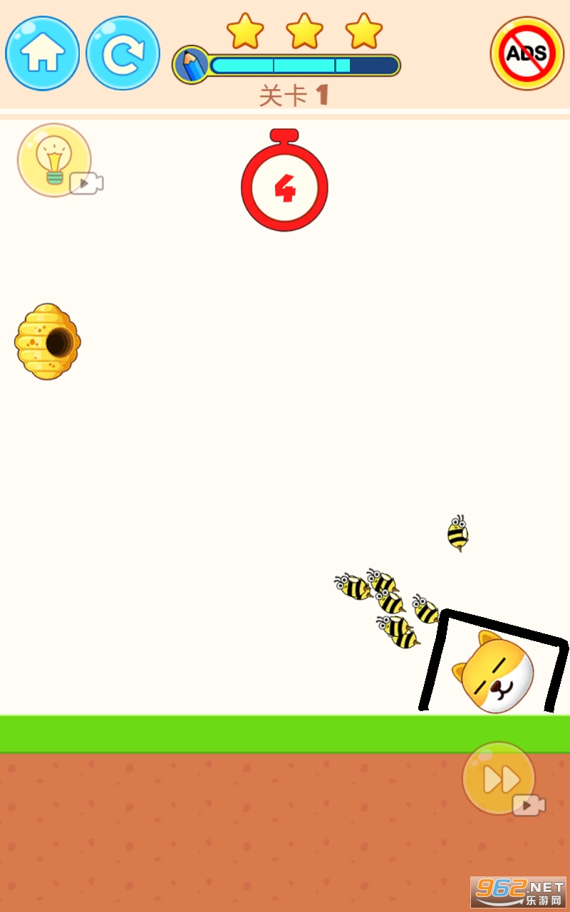 触摸屏幕画一条线,以保护小狗免受蜜蜂的攻击。