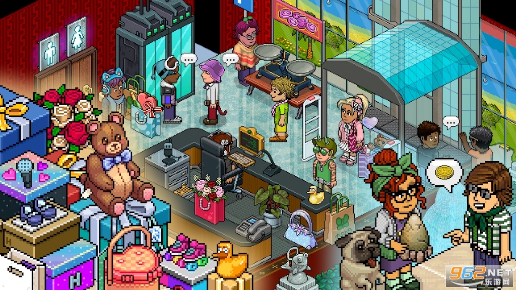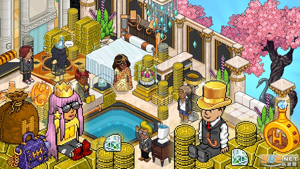 使用多种家具和装饰品来设计和定制您自己的酒店房间!发挥您的想象力,发挥您的创造力!创建一个舒适的冬季城堡、一条熙熙攘攘的赛博朋克街道或一个疯狂的科学家实验室,唯一的限制就是你的创造力!Habbo 已建造了超过 5 亿个房间,玩家可以使用各种家具和像素物品来创造他们的梦想空间。每个月都会推出新系列!