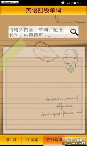 英语四级词汇是一款专门为安卓用户打造的英语四级考试CET-4大学必考内容应用软件,其主要包括了听力理解、阅读理解、翻译、写作等内容,该软件总计约6000个词汇,让您随时随地学习,欢迎下载使用!