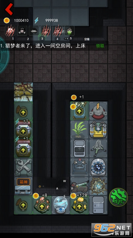 快快躲进床铺,建立你的设施和防线,共同抵御猛鬼吧!