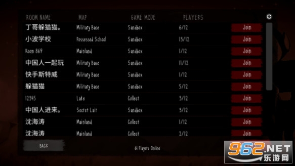 2、如何联机: 进入游戏点击Play Online,可以选择Join可以加入其他人创建的房问,也可以选择CREATE A ROOM创建一个新的房间 (每个房问可容纳最多12人)