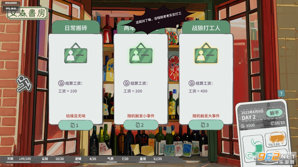 经营:最基础的玩法/特色则是经营环节,利用初始金额3000,在城市中生活下去,并且赚更多的钱,才有机会挖掘这个世界的真相。