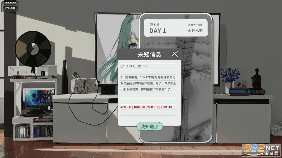 《N+1:失业青年的新生活(N1Plus_Demo)》是一款以失业为题材的模拟休闲手游,游戏中玩家将扮演一个被公司辞退并获得N+1赔偿的失业青年,作为一个失业的青年,你可以自由的模拟自己以后的生活,可以直接躺平,可以前往各个场所去玩乐,可以去打工,也可以去创建公司等,体验不一样的生活。