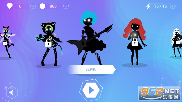界面可谓清新脱俗,没有其他冗余的元素,左右滑动即可选择不同的原创电音开始游戏。还可以解锁不同的人物形象进行游戏。