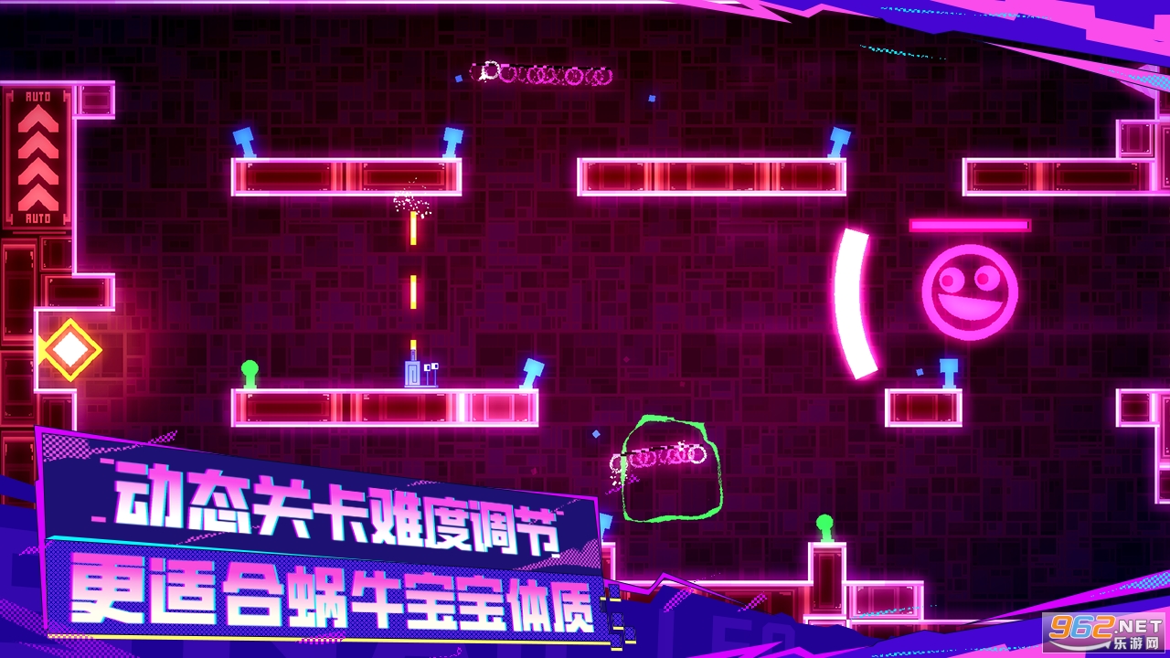战胜人工智能!这些关卡起初看似容易,但游戏的人工智能反派会根据你的通关时间和死亡次数来调整你的游戏难度,并且逐步掌握更多关于你的资讯,并使用它的能力对抗你。你可以随时变换游戏难度,或让游戏决定适合你的难度。通关太快?那就准备面对更多的子弹和钉子吧。